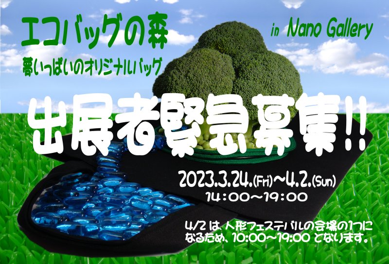 | 「エコバッグの森」in Nano Gallery --- 夢いっぱいオリジナルバッグ100点の展示 ---- 満開の桜に負けず劣らず、Nano Gallery内も色あざやかにエコバッグが咲き乱れております。 個性溢れるアート作品を身近に感じられる夢いっぱいのユニークな展示です。また、4/4は、人形フェステバルの会場の1つにもなります。是非御来場ください。 ☆出展作家 ナカオ ミノリ イルカちゃん メリ野 りんご*いこまちずえ 松本涼 太田宝見 ざべす 大川陽子 かずさ KONPEITO 前田明子 d.d.豆四郎 木材 senka ひらおちえ kaori 塩田 浩子 川瀬大樹 魔可多宮 ナツ Lissa Kylin とやまきこ あっちょ 栗本 クミ子 TAKOまま 岐部稚子 ぴちゅな 平林涼子 ろくたくろ おおしろ晃 キモグロ派代表穂苅有香 MARY Chukuyan 松下千穂子 kaori Lacca モニカ 豊嵜恭子 Pengin Aruki 他 |