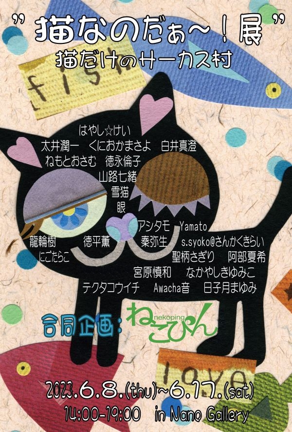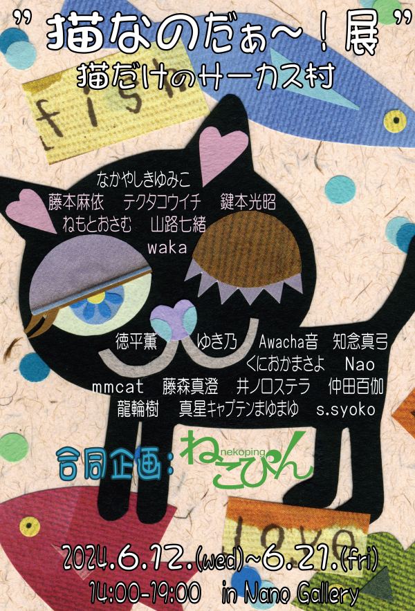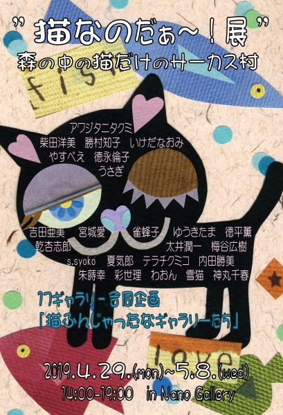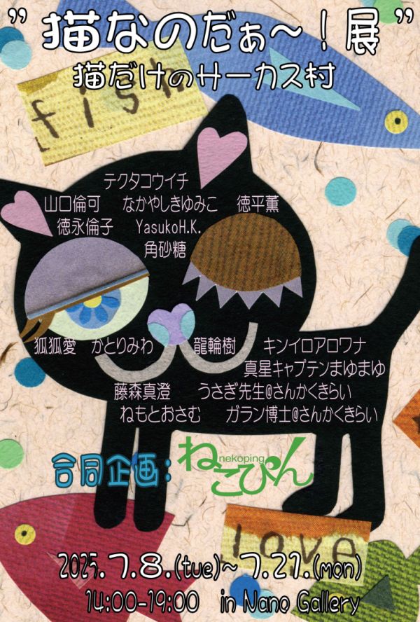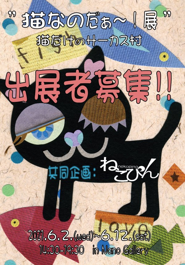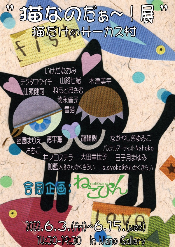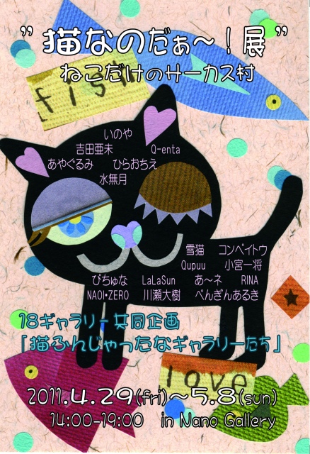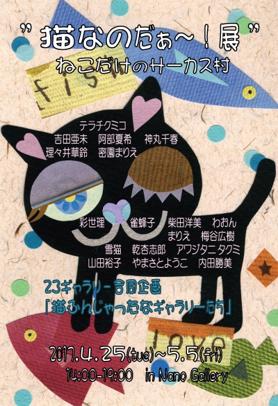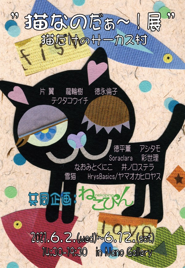 | - 猫だけのサーカス村 - 可愛い猫、紳士猫、怪しい猫、お色気いっぱいの猫まで、 サーカスの中にはあらゆる猫が集まりました。 底抜けに明るい表舞台、ちょっと隠微で哀愁漂う裏舞台、 サーカスは、色々な表情をもってい ます。 ●開催期間 7月8日(火)~7月21日(月) ●開廊時間 14:00-19:00 ●出展作家 なかやしきゆみこ 藤森真澄 ねもとおさむ 徳平薫 テクタコウイチ かとりみわ 山口倫可 龍輪樹 狐狐愛 キンイロアロワナ うさぎ先生@さんかくきらい 真星キャプテンまゆまゆ ガラン博士@さんかくきらい 角砂糖 YasukoH.K. 徳永倫子 井口ステラ ●関連サイト等 Face Book event |