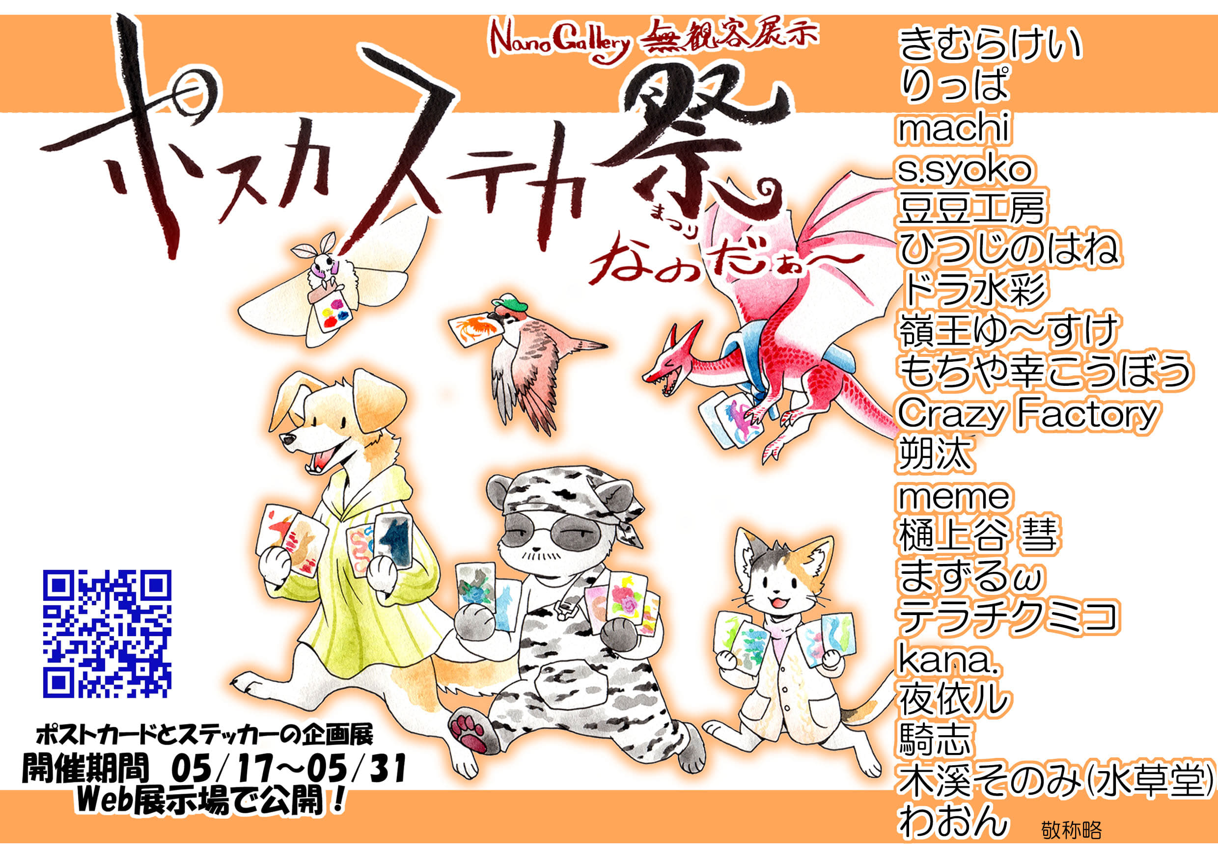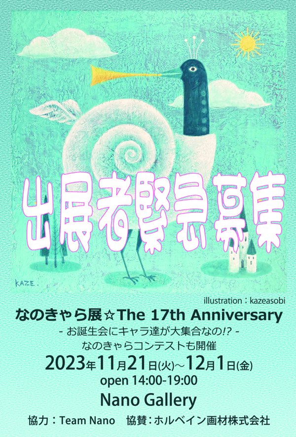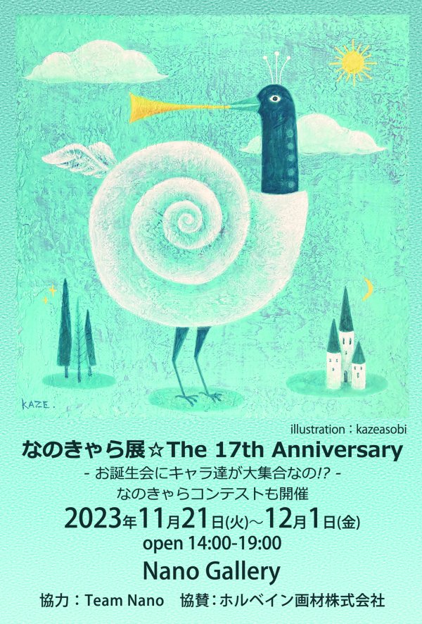 | 多様な存在が共鳴し 僕らはみんないきている 呼吸しているこの星で! ★なのきゃらコンテスト16th 最優秀賞受賞記念展 ●開催期間 12月02日(火)~12月07日(日) ●開廊時間 14:00-19:00 (最終日17:00まで) ●出展作家 kazeasobi ●関連サイト等 facebook event |