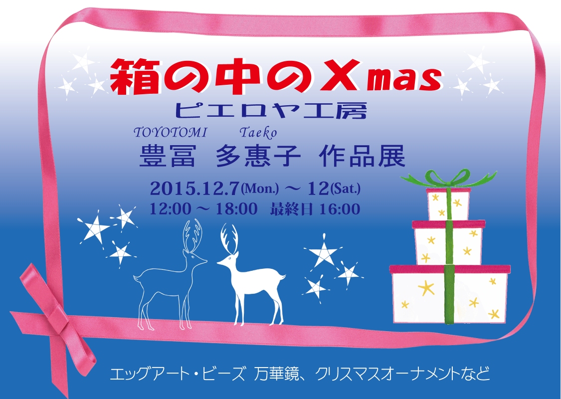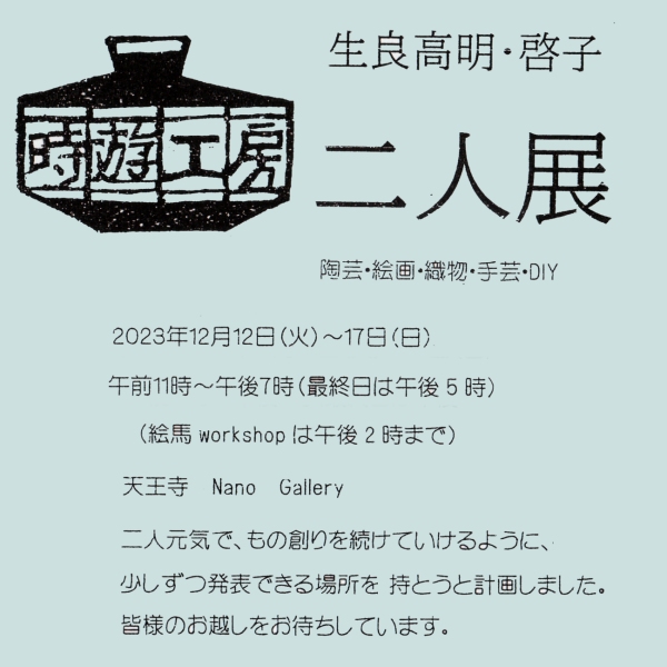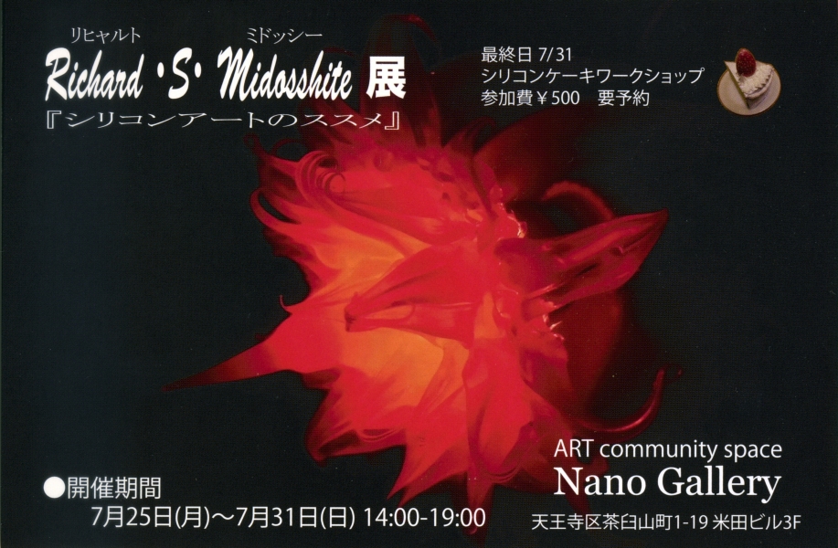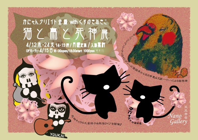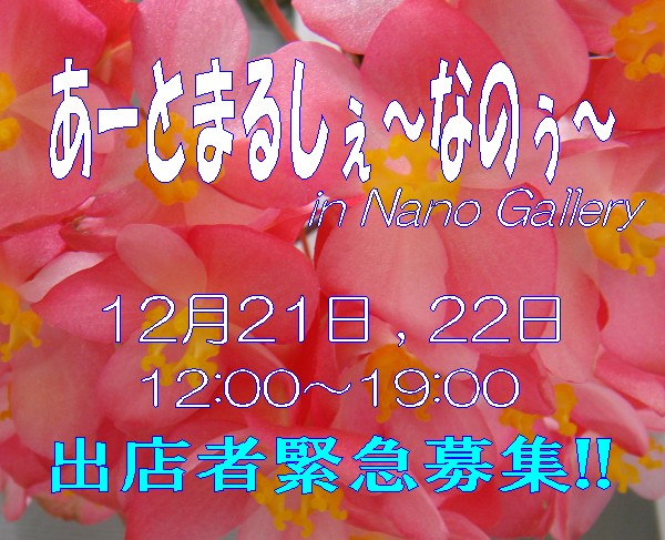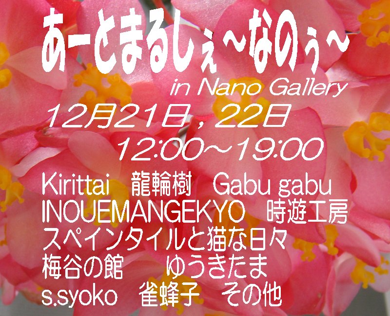 | 1 Drink 1 Food 1 ART Nano Galleryの3周年記念パティー 1月遅れの開廊記念+クリスマス+忘年会です。 気軽に参加していただける持ち寄りパーティです。 どなたでも大歓迎です。 お誘いあわせの上、御来場ください。 1 Drink お好みの飲み物を1種類お持ち下さい。 誰かと一緒に味わいたい飲み物です。 1 Food 自慢の料理1品をおもちください。 自作でも購入したものでもOKです。 1 ART 作品を1点お持ち下さい。 形態は自由です。新作、旧作を問いません。 平面や立体もちろんのこと、一芸、一曲の御披露も歓迎。 |