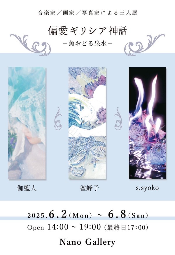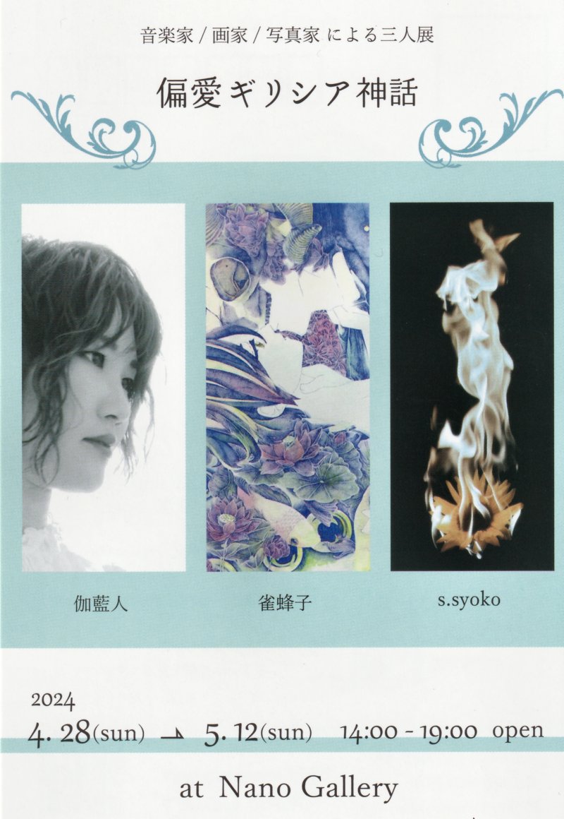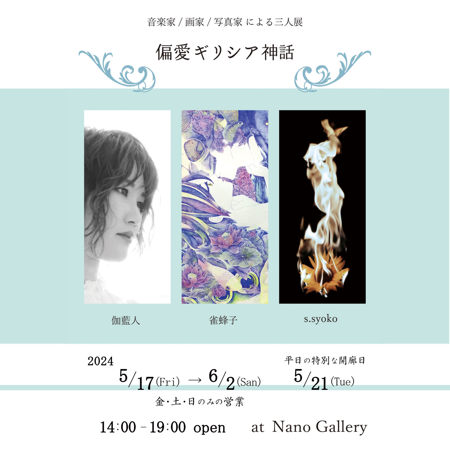 | ●開催期間 06月02日(月)~06月08日(日) ●開廊時間 14:00-19:00 ◆演劇&ダンスイベント 6/7(土)講演 15時 / 17時 全席自由/観覧無料/講演40分 ●出展作家 伽藍人 雀蜂子 s.syoko ●関連サイト等 Face Book event #偏愛ギリシア神話 |