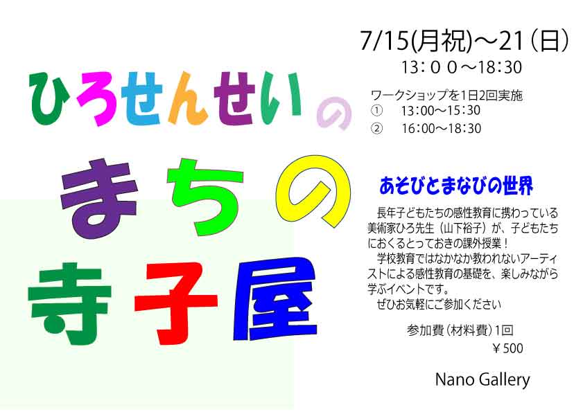 | NANOギャラリーで、のんびりしませんか? アート、手作りが好きな人同士の交流の場にしていただいたり。少しばかり、絵本やナチュラル系雑誌などなどの本をご用意していますので、のんびり読んでいただいたりできます。 ご希望の方には、絵封筒制作キットをご用意しています。 (簡単に、1~2時間程で創っていただけます) 暑い日が続きますが、のんびりお立ち寄り下さいね |