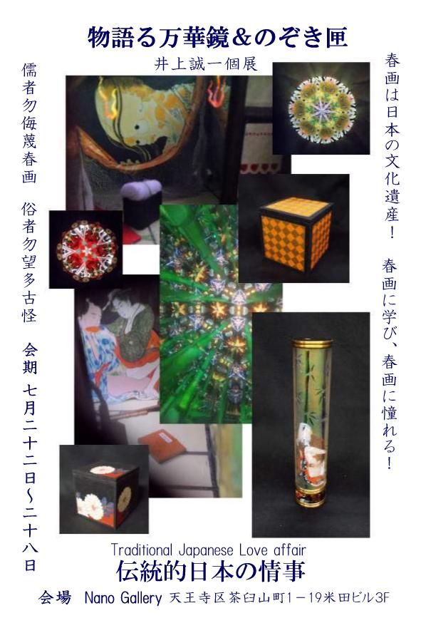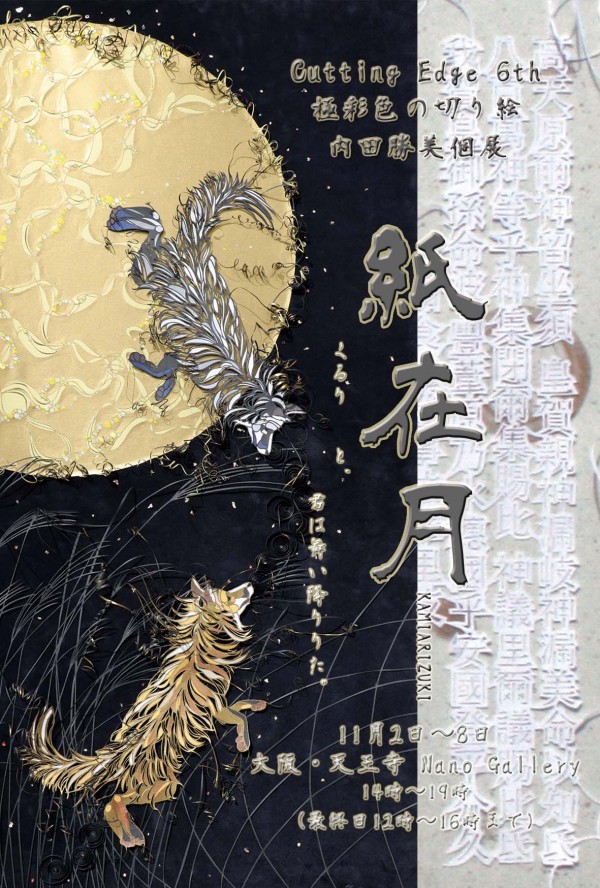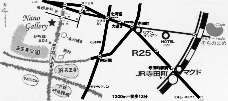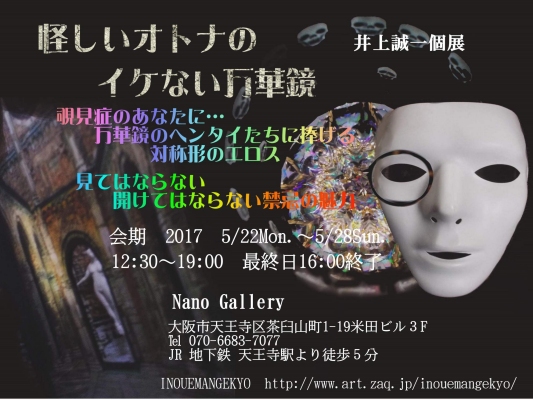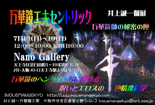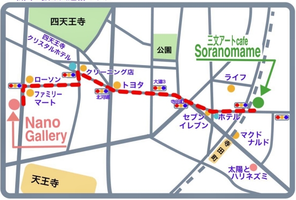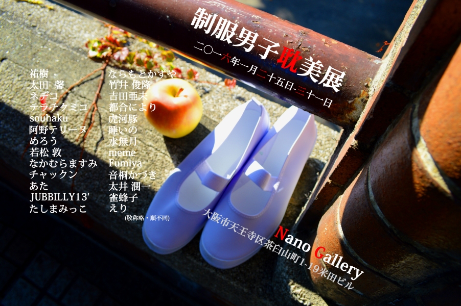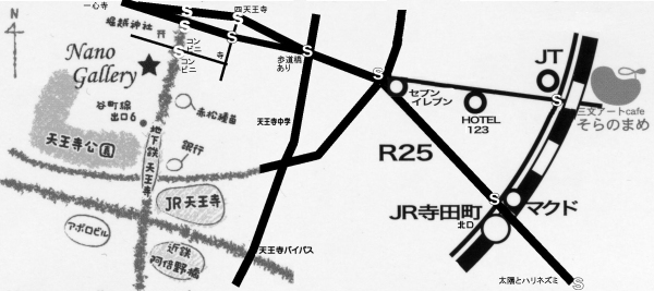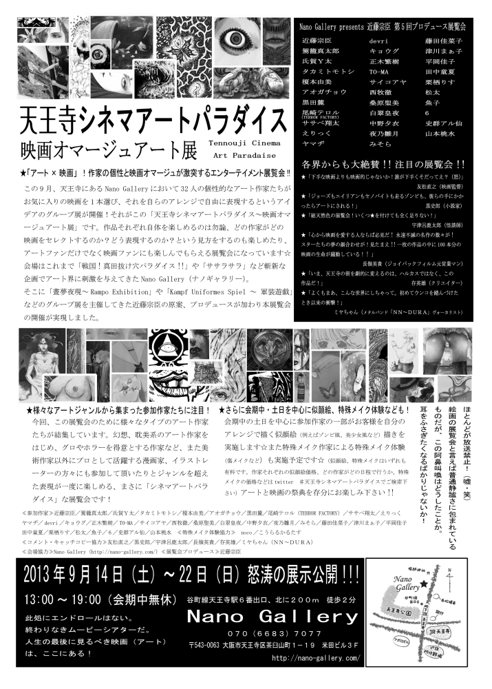 | 大阪の上町台地に真田幸村が残した伝説の2つの抜け穴がある。 大阪城←→真田山 大阪城←→茶臼山の幻の2つのルートを極秘に接続してしまった「そらのまめ」と「Nano」です。 その結果、抜け穴の奥に潜む彼らが長い眠りから目覚めてしまった。 そして、彼らは、深夜に真紅の甲冑を身にまとい六紋銭の幟を掲げ現れ、神出鬼没不可解な活躍することとなった。 「そらのまめ」と「Nano」間を往き来することになった彼らは、神出鬼没な活躍の1つとして、深夜に抜け穴を通じて、出展作品の移動を行うという前代未聞の事態が始まった。 ●出展作家 ナカオミノリ 樋口一尉 イマイフミ 栗本 クミ子 蛇目 小宮一将 あっちょ yu-ko 松下千穂子 YOSH ●関連サイト等 ☆樋口一尉 H.P. : http://seraphism.net/ ☆YOSH H.P. : http://passion-yosh.chu.jp/ ☆三文アートcafeそらのまめ H.P. : http://www.soranomame.com Mixi :http://mixi.jp/view_community.pl?id=445931 ☆ART community space Nano Gallery H.P. : http://nano-gallery.com Mixi :http://c.mixi.jp/nano_gallery |