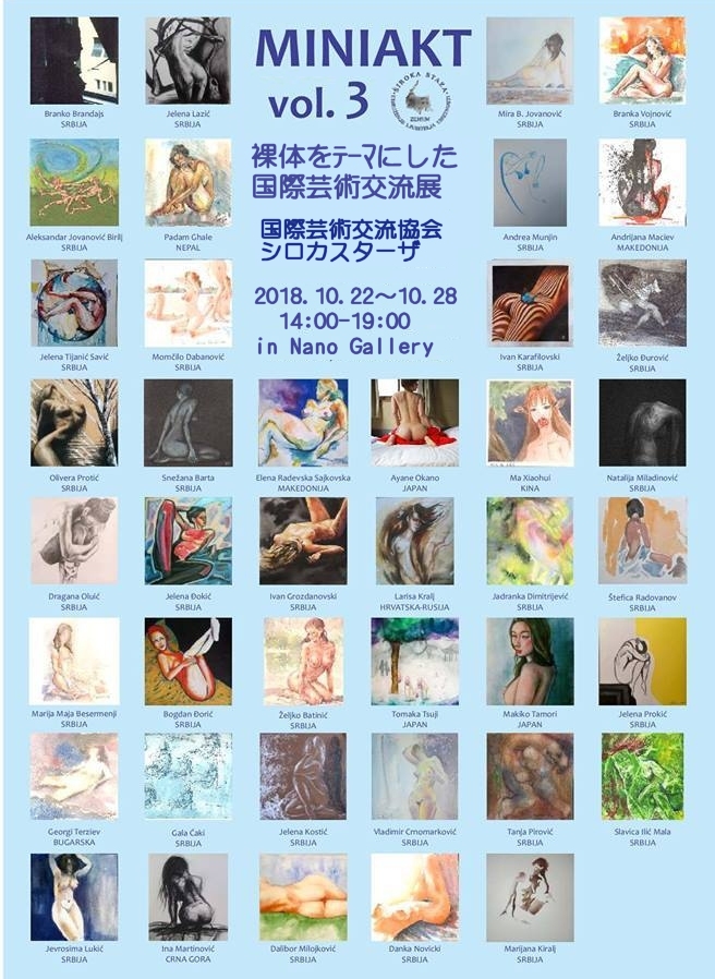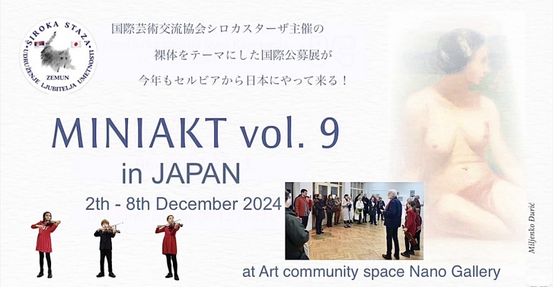 | 絵画や版画、写真などの多様な表現技法で、作家が自由に表現した小さな平面作品をご覧に入れます。 今回は、セルビア、オーストリア、ボスニア・ヘルツェゴビナ、インド、マレーシア、ネパール、ハンガリー、トルコ、ナイジェリア、ポーランド、ロシア、チェコ、バングラデシュ、パキスタン、北マケドニア、ペルー、日本と世界17カ国からの51人のアーティストが集いました。 お陰様で10年間、継続して参りましたが、今回を持ちまして本企画は最終回となります。 ◆主催:国際芸術交流協会シロカスターザ/アトリエ青 ◆協賛:Nano Gallery ●開催期間 11月10日(月)~11月16日(日) ●開廊時間 14:00-19:00 ●出展作家 Anja Ani?i? SERBIA アンヤ・アニチッチ(セルビア) Caka Kova?evi? SERBIA ツァカ・コヴァチェヴィッチ(セルビア) Milena Radivojevi? SERBIA ミレナ・ラディヴォイェヴィッチ(セルビア) Christine Cezanne-Thauss AUSTRIA クリスティーヌ・セザンヌ=タウス(オーストリア) Jevrosima Luki? SERBIA イェヴロシマ・ルキッチ(セルビア) Ma?a Jovaleki? SERBIA マーシャ・ヨヴァレキッチ(セルビア) Mira Nogo BIH ミラ・ノゴ(ボスニア・ヘルツェゴビナ) Parag Pendharkar INDIA パラグ・ペンドハルカル(インド) Suzana Gigi? SERBIA スザナ・ジジッチ(セルビア) Milijana Radovanovi? SERBIA ミリヤナ・ラドヴァノヴィッチ(セルビア) Roland Gomez PERU ローランド・ゴメス(ペルー) Seeling Tan MALAYSIA シーリン・タン(マレーシア) Padam Ghale NEPAL パダム・ガレ(ネパール) Mihaly Gal HUNGARY ミハイ・ガル(ハンガリー) Cennet ?nce Erdo?du TURKEY セネット・インジェ・エルドードゥ(トルコ) Kolawole Adedeji NIGERIA コラウォレ・アデデジ(ナイジェリア) Aleksandra Duh SERBIA アレクサンドラ・ドゥー(セルビア) Kasia J. Siuda POLAND カシア・J・シウダ(ポーランド) Hanna Dujmovi? BIH ハンナ・ドゥイモヴィッチ(ボスニア・ヘルツェゴビナ) Anna Abidina RUSSIA アンナ・アビディナ(ロシア) Milica Maru?i? SERBIA ミリツァ・マルシッチ(セルビア) Darko Topalski SERBIA ダルコ・トパルスキ(セルビア) Bogdan ?ori? SERBIA ボグダン・ジョリッチ(セルビア) Michael Holik CZECH ミハエル・ホリク(チェコ) Nao JAPAN Nao(日本) Darya Avci TURKEY ダリヤ・アヴジ(トルコ) Jasmina Mima Vasiljevi? ヤスミナ・ミマ・ヴァシリェヴィッチ(セルビア) Lejla Mustafi? BIH レイラ・ムスタフィッチ(ボスニア・ヘルツェゴビナ) Lina Trenkoska N. MACEDONIA リナ・トレンコスカ(北マケドニア) Anastasija Vasi? SERBIA アナスタシヤ・ヴァシッチ(セルビア) Du?an Ga?anski SERBIA ドゥシャン・ガジャンスキ(セルビア) Henryka Langrzyk POLAND ヘンリカ・ラングジク(ポーランド) Yumi Terashima JAPAN 寺嶋 夕美(日本) Huseyin Gunduz TURKEY フセイン・ギュンドゥズ(トルコ) Jasmina Mi?elji? SERBIA ヤスミナ・ミシェリッチ(セルビア) Nikola Mitrovi? SERBIA ニコラ・ミトロヴィッチ(セルビア) Zdravka Jakovljevi? SERBIA ズドラヴカ・ヤコヴリェヴィッチ(セルビア) Branko Brandajs SERBIA ブランコ・ブランダイス(セルビア) Marieta Kurczera Rok POLAND マリエタ・クルチェラ・ロク(ポーランド) Ewelina Szczepa?ska POLAND エヴェリナ・シュチェパニスカ(ポーランド) Mihajlo Vojnovi? SERBIA ミハイロ・ヴォイノヴィッチ(セルビア) Barbara P?aczek POLAND バルバラ・プワチェク(ポーランド) Naseeb Khan PAKISTAN ナシーブ・カーン(パキスタン) ?eljko ?urovi? SERBIA ジェリコ・ジュロヴィッチ(セルビア) Marija Miladinovi? SERBIA マリヤ・ミラディノヴィッチ(セルビア) Edith Kovacs HUNGARY エディト・コヴァーチ(ハンガリー) Milica Alimpi? Ili? SERBIA ミリツァ・アリンピッチ・イリッチ(セルビア) Md Iftekhar Hoshen BANGLADESH ムハンマド・イフテカル・ホシェン(バングラデシュ) Jovana Markovi? SERBIA ヨヴァナ・マルコヴィッチ(セルビア) Stefan Anchevski N. MACEDONIA ステファン・アンチェフスキ(北マケドニア) Mira Kova?evi? SERBIA ミラ・コヴァチェヴィッチ(セルビア) ●関連サイト等 facebook event |