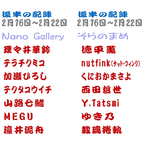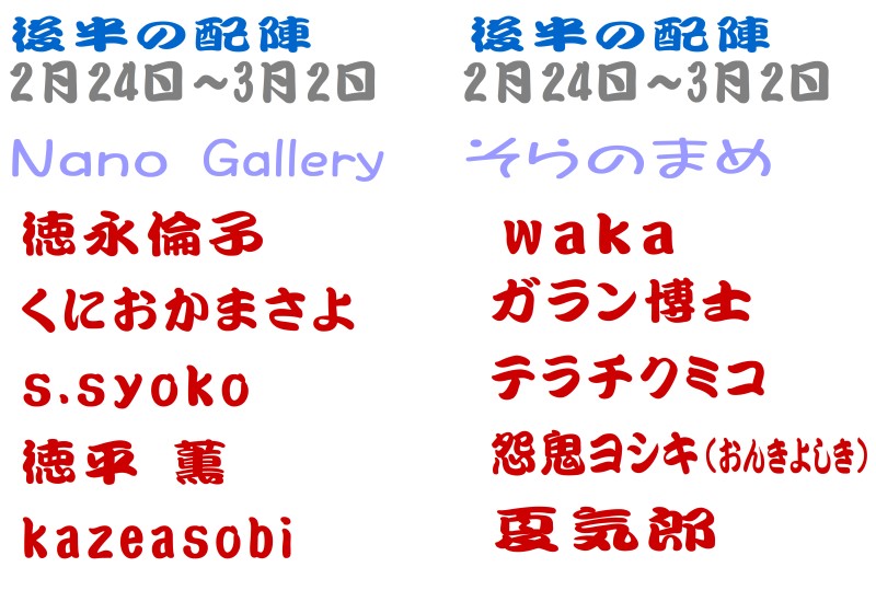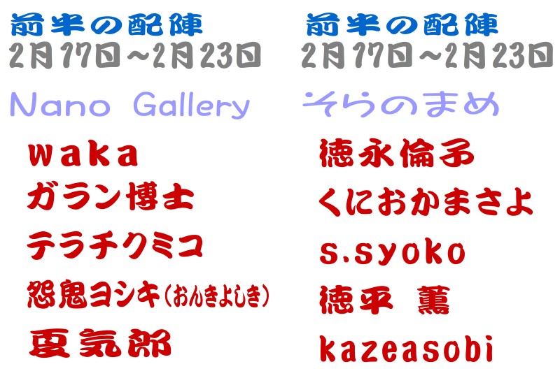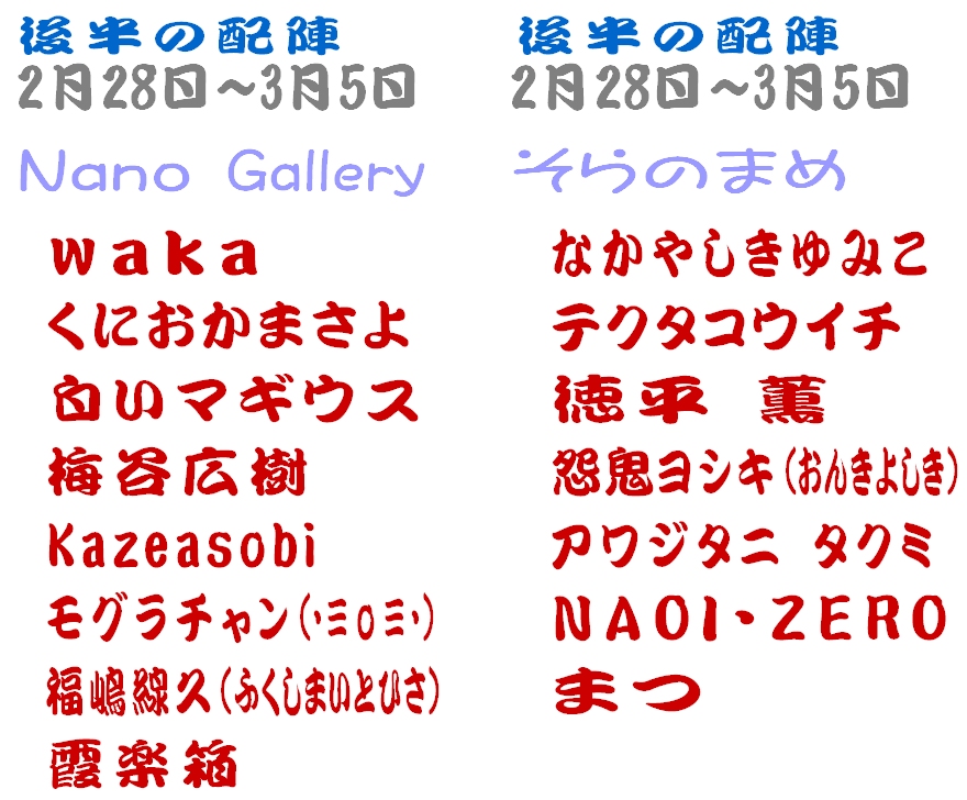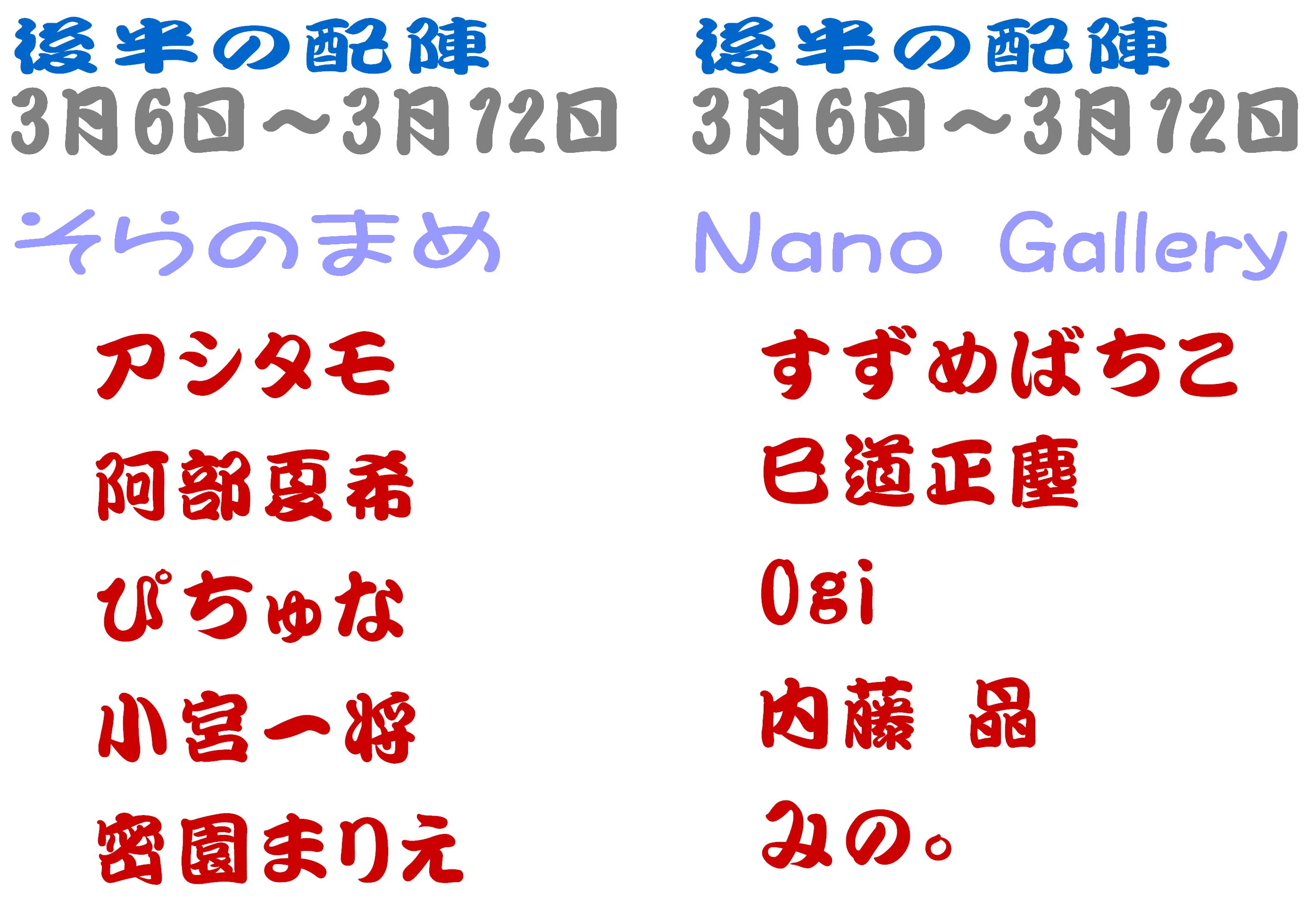 ☆ART community space☆ Nano Gallery 2/28(日) FGHIJ 3/01(月) FGHIJ→ 3/02(火) EFGHI 3/03(水) EFGHI 3/04(木) EFGHI→ 3/05(金) DEFGH 3/06(土) DEFGH→ 3/07(日) CDEFG 3/08(月) CDEFG→ 3/09(火) BCDEF 3/10(水) BCDEF 3/11(木) BCDEF→ 3/12(金) ABCDE 3/13(土) ABCDE |