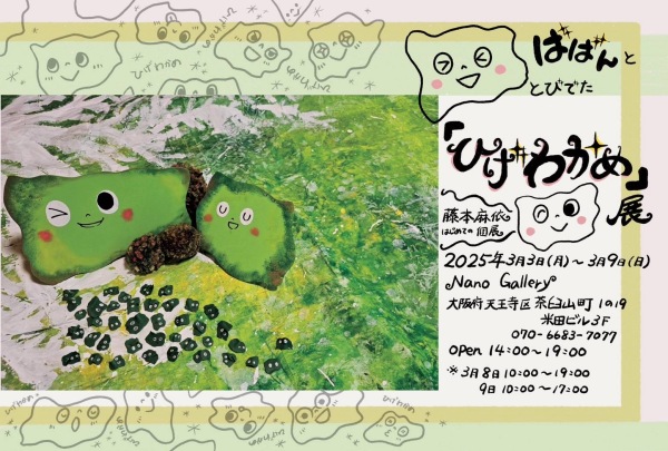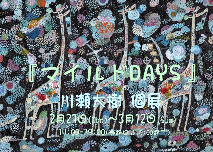 | ●開催期間 03月03日(月)~03月09日(日) ●開廊時間 14:00-19:00 3/8(土)10:00-19:00 3/9(日)10:00-17:00 ●出展作家 藤本麻依 ●関連サイト等 Face Book event |