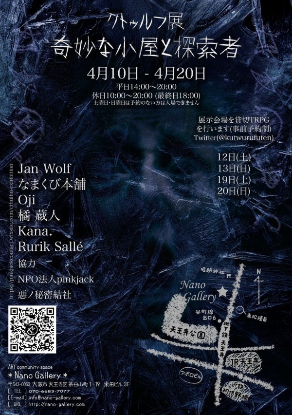 | ●開催期間 04月10日(木)-04月20日(日) 貸切イベント日程 04/12(土)、04/13(日)、04/19(土)、04/20(日) (事前予約制 一般者入場不可) ●開廊時間 平日:14:00-20:00 休日:10:00-20:00 最終日18:00迄 ●出展作家 Jan Wolf Rurik Salle Oji kana. 橘 蔵人 なまくび本舗 ●協力 NPO法人pinkjack 悪ノ秘密結社 ●関連サイト等 クトゥルフ展 祖父の謎 |