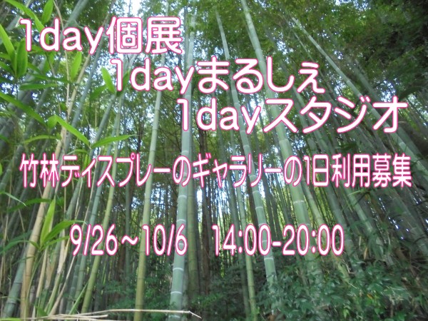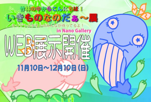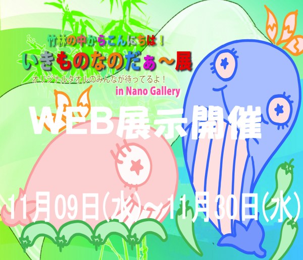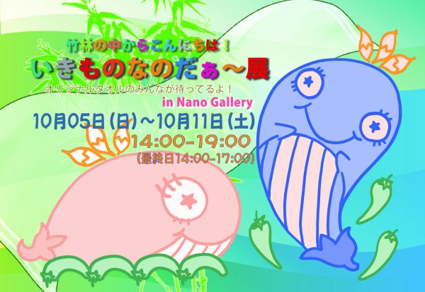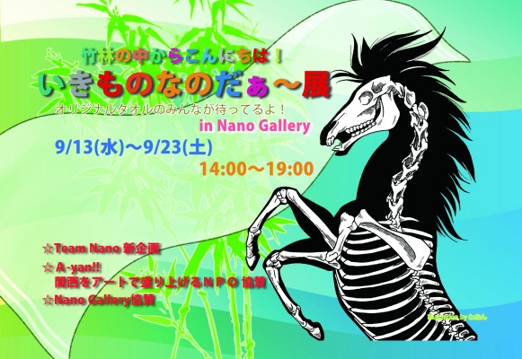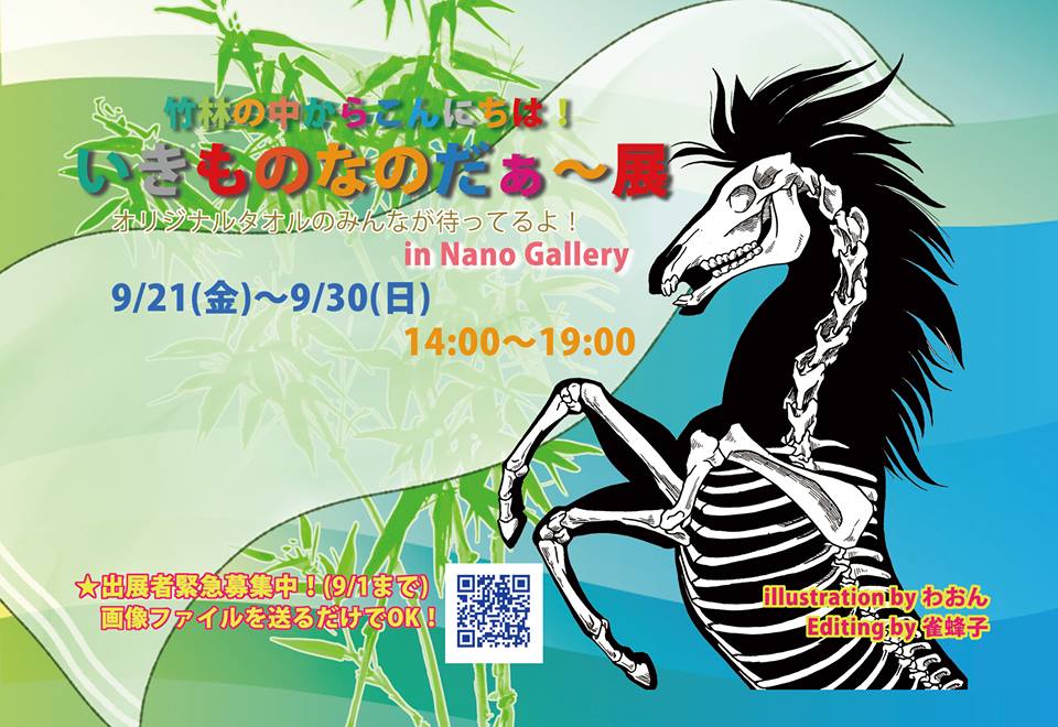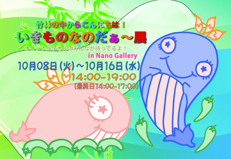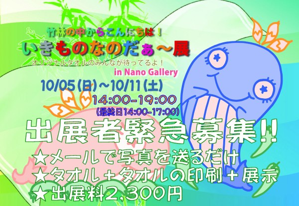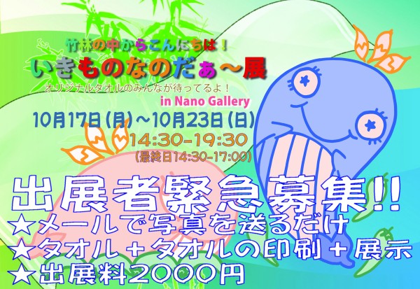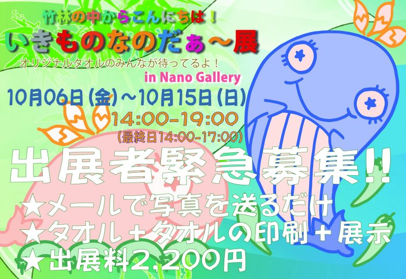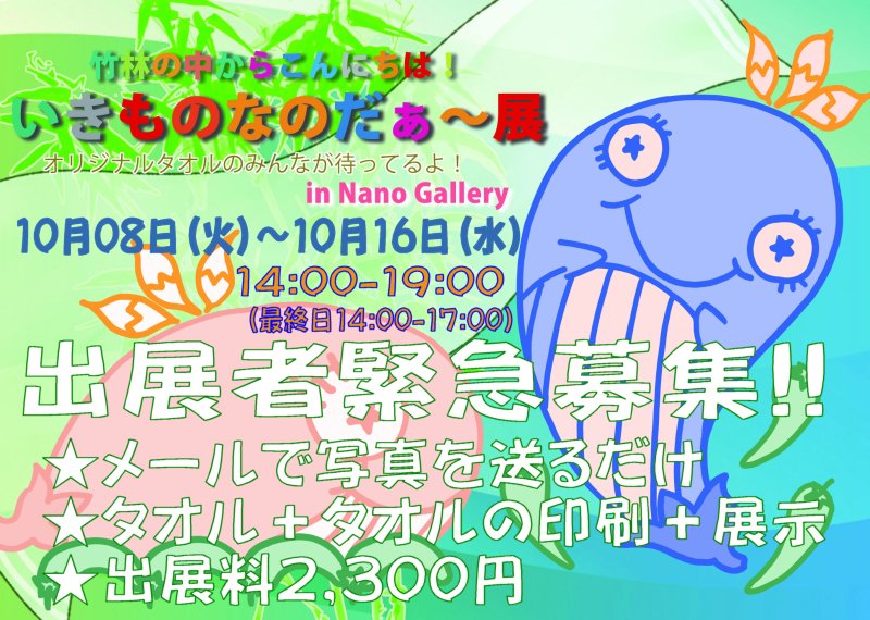 | 『いきものなのだぁ~展』出展者緊急募集 --竹林の中からこんにちは-- オリジナルタオルのみんなが待ってるよ! 生き物をテーマにしたオリジナルタオル展です。 竹林の中のようにディスプレイした中で展示会です。 写真をメールで送るだけで、タオルの制作、展示、販売ができます。 ★★参加要項概略★★ 応募締切 : 09/26(金) ※エントリー時に画像ファイルで搬入 開催期間:10/05(日)~10/11(土) 搬出日時:10/12(日) 12:00~16:00 出 展 費 :2,300円 (1作品につき) ※タオル+タオル印刷+展示+DM制作を含む ☆Team Nano 企画 ☆Nano Gallery協賛 ★★参加要項詳細★★(クリックしてください) |