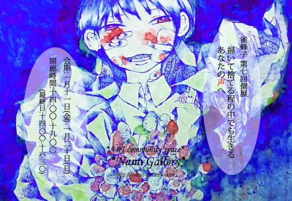 | ●開催期間 12月08日(月)~12月14日(日) ●開廊時間 14:00-18:00 (最終日12:00-16:00) ●出展作家 虎河豚 雀蜂子(スズメバチコ) moku-son 戌ヰヒロシ 紫綾(シア) 木純透(キスミトオル) 絵葉書屋 長崎堂 本田読 ●関連サイト等 facebook event |