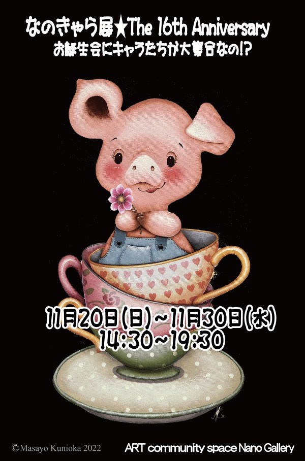 | 2周年記念ティーパーティ 「お茶会Nanoだ!」+「ちょっとだけアート」しましょう。 お陰様で、Nano Galleryの開廊させていただいて2周年を 迎えることができました。ささやかではありますが、2周年 を記念してティーパーティを開催させていただきます。 是非、お誘い合わせの上御来廊下さい。 ☆「自家製ケーキ」+「クッキー」+「お茶」してください。 ☆アートについて熱く語ってくださ~い。 ☆「缶バッチ」制作しましょう。 内径30mm(イラスト部) 外径46mm(余白部を含めて) 御来廊されてから描いて頂くのも可能です。 ☆ラミネートで「しおり」制作 描いていただく事も出来ます。 面倒だという方は、色づいた落ち葉を1枚拾って来てください。 ☆綿菓子作り 童心に返って綿菓子を作ってみてください。 もちろん、作った後は召し上がってください。 |