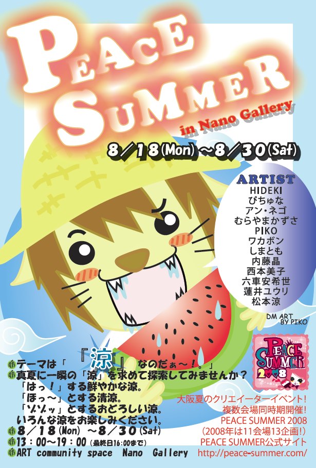 大阪夏のクリエイーターイベント! 複数会場同時期開催! PEACE SUMMER 2008 (2008年は11会場13企画!) PEACE SUMMER公式サイト http://peace-summer.com/ |