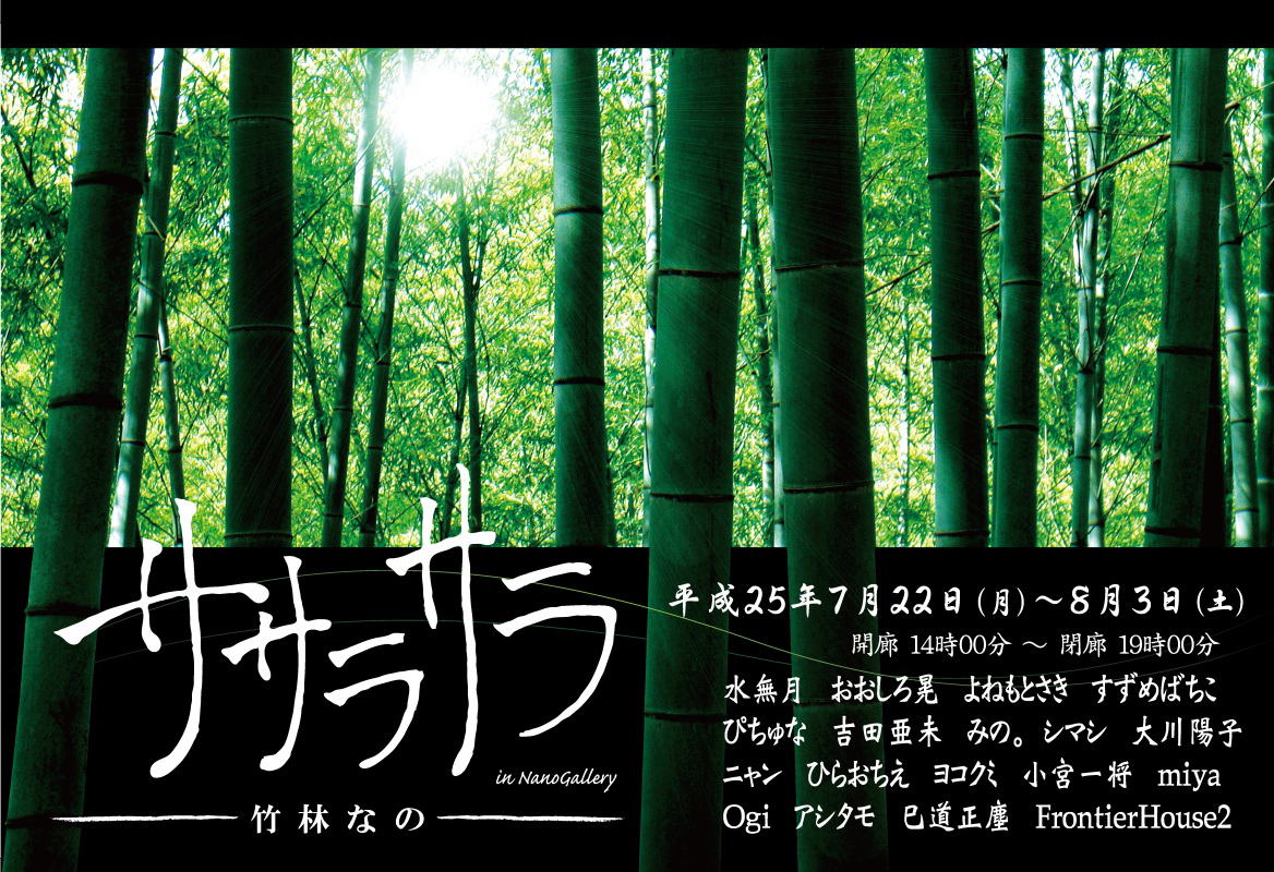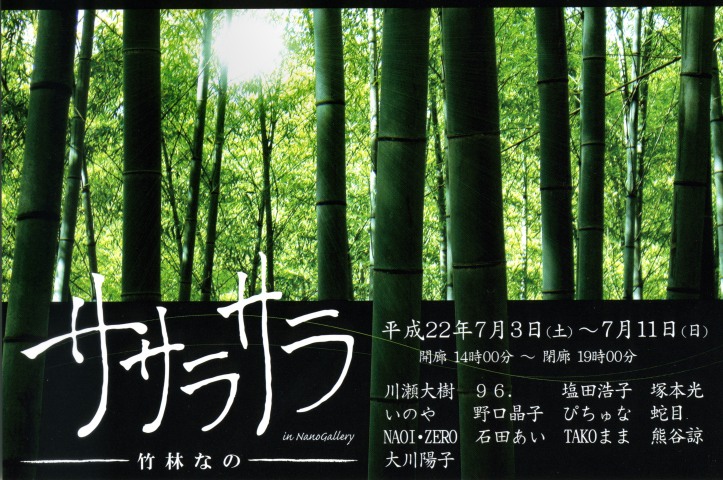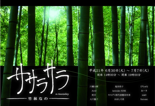 | Nano Gallery 第7回企画展です。 竹は青々としてまっすぐ伸びる様子から、榊(さかき)とともに清浄な植物のひとつとされており、かぐや姫や七夕のなど竹や笹にまつわる習俗・慣習も多いものです。 展示期間中、Gallery Spaceは竹林のように本物の竹でいっぱいです。 ☆出展作家 川瀬大樹 塩田浩子 96. 塚本光 いのや 野口晶子 NAOI ZERO ぴちゅな 熊谷諒 石田あい TAKOまま 蛇目 大川陽子 ☆関連サイト 川瀬大樹 96. (facebook内) 塚本光 野口晶子 ぴちゅな 熊谷諒 石田あい TAKOまま 蛇目 Nano Gallery ホームページ Nano Gallery Mixi内コミュニティ |