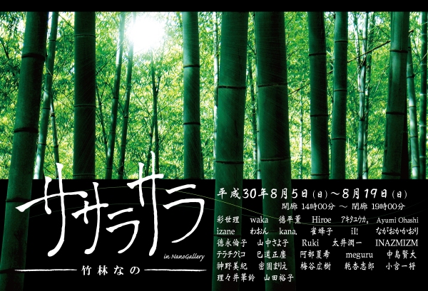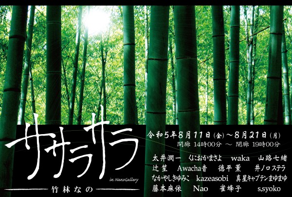 Spaceは竹林のように本物の竹でいっぱいになります。陽に陰に竹林で遊んで癒されてみてください。 ●開催期間 8月02日(土)~8月11日(月) ●開廊時間 14:00~19:00 ●出展作家 s.syoko テクタコウイチ 井ノ口ステラ なかやしきゆみこ 雀蜂子 徳平薫 waka 山路七緒 藤森真澄 Nao HAROME kazeasobi Olivia Obrecht 真星キャプテンまゆまゆ ●関連サイト等 Nano Gallery Web site Nano Gallery X Nano Gallery instagram Nano Gallery FaceBook facebook events 以前の『ササラサラ』の様子 #ササラサラ #竹 #笹 #NanoGallery #竹林 #竹林なの |