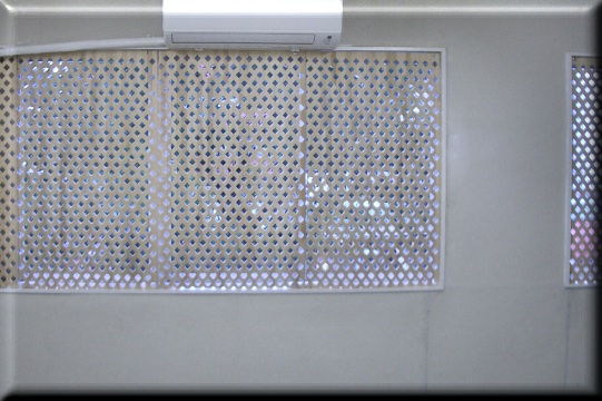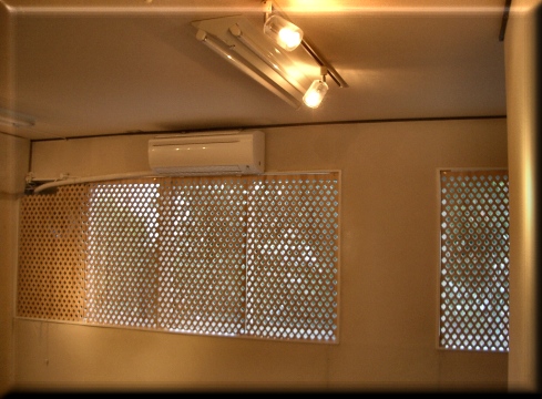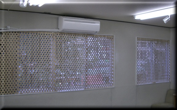 | ギャラリー内の東側の壁です。 木製パネルは6枚あります、その一部だけを使用したり その裏側に光を遮蔽するものを入れることで、自然光を 入れない通常の壁として使用も可能です。 |